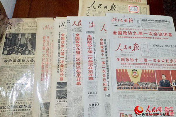 “這是3月21日的黨報,今年兩會閉幕了,我的這一屆兩會報道內容的報紙搜集工作也算是完成了!84歲的浙江諸暨老人黃仕根,把這張刊載著今年兩會閉幕報道的報紙鄭重地插進桌上的報夾,用手撫了撫報紙上的褶皺,露出了笑容。