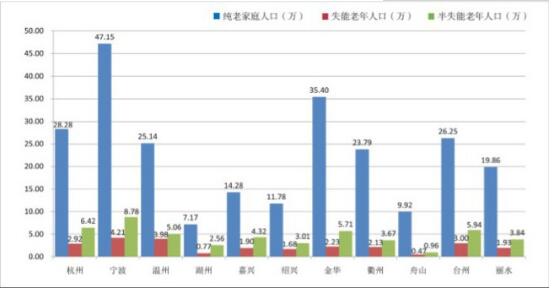 全省純老家庭人口數(shù)為249.00萬(wàn)人,占老年人口總數(shù)的23.06%。純老家庭人口數(shù)列前3位的依次為寧波市、金華市和杭州市,分別為47.15萬(wàn)人、35.40萬(wàn)人和28.28萬(wàn)人;全省失能、半失能老年人口共75.50萬(wàn)人,占老年人口總數(shù)的6.99%,其中:失能和半失能老年人口分別為25.23萬(wàn)人、50.27萬(wàn)人。失能、半失能老年人口數(shù)列前3位的依次為寧波市、杭州市和溫州市,分別為12.99萬(wàn)人、9.33萬(wàn)人和9.03萬(wàn)人。