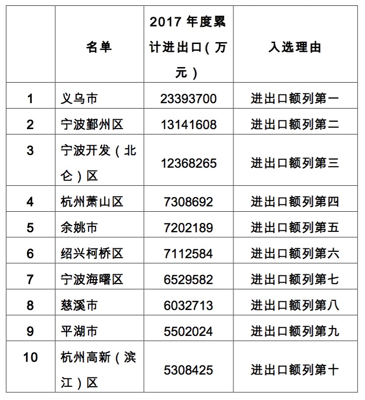 5月9日在杭州召開的全省對外開放大會上,2017年度浙江省外貿十強縣(市、區)正式出爐,義烏市、寧波市鄞州區、寧波市北侖區位列“三甲”,杭州市蕭山區、余姚市、紹興市柯橋區、寧波市海曙區、慈溪市、平湖市、杭州高新開發區緊隨其后。