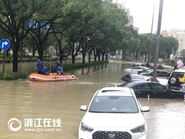 記者在溫嶺市區看到,溫嶺國際大酒店門口,積水約莫有一米深,搶險人員正乘船查看情況,為下一步工作做準備。受強風暴雨影響,一些碗口粗的樹被吹倒或刮斷。從這里出發,沿著中華路向東南方向行走,一些地方的積水已沒過膝蓋,一些車輛已經“趴窩”。