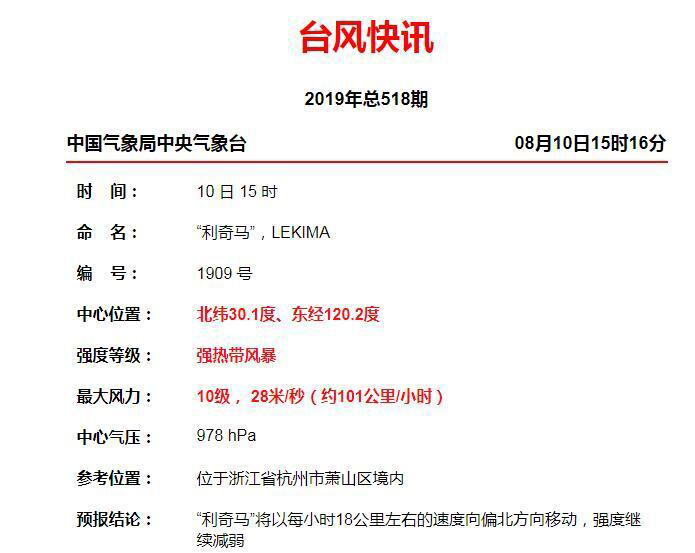 10日15時16分:目前利奇馬中心位置北緯30.1度、東經120.2度,位于浙江省杭州市蕭山區境內!袄骜R”將以每小時18公里左右的速度向偏北方向移動,強度繼續減弱。