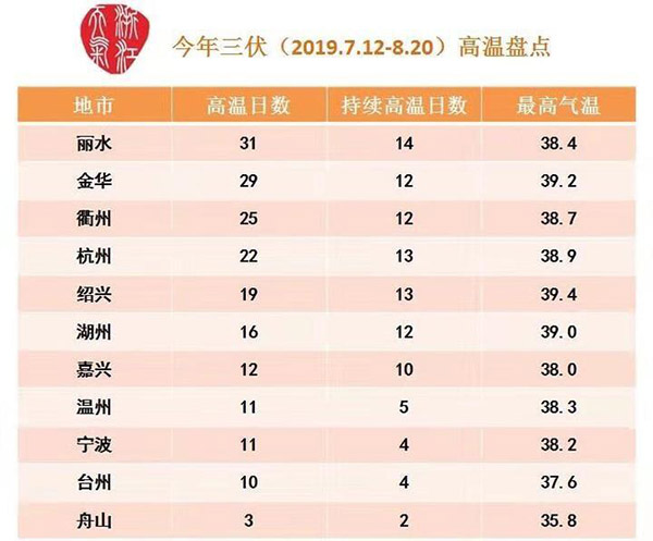 今年夏天,浙江的最高氣溫出現(xiàn)在哪?浙江省氣象服務中心發(fā)布了今年三伏天的高溫盤點,三伏天里,高溫日數(shù)和持續(xù)高溫日數(shù)最多的市均為麗水,分別為31天和14天,而最高氣溫則出現(xiàn)在紹興,為39.4℃。
