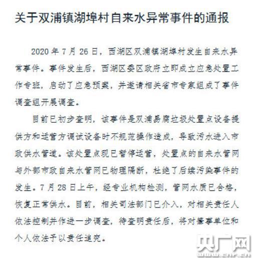 央廣網杭州7月30日消息(記者曹文君 范雨婷)7月30日下午,杭州西湖區通報了關于雙浦鎮湖埠村自來水異常事件的相關情況,全文如下:
